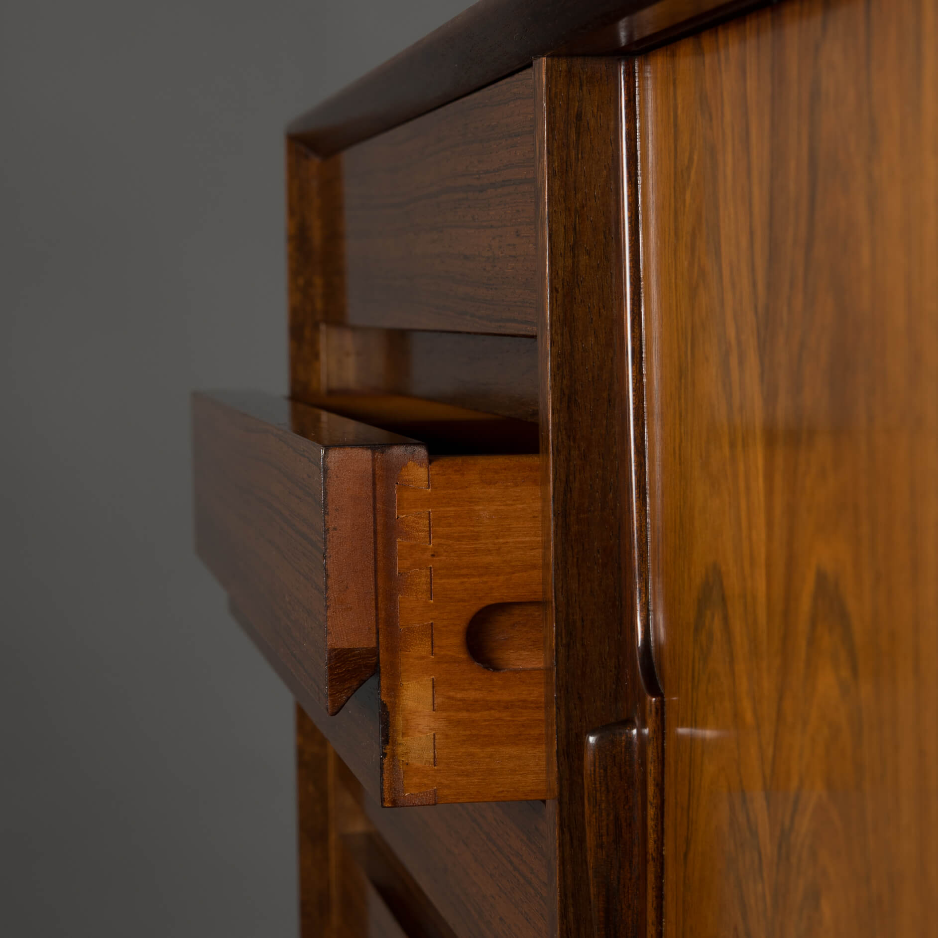 De schuifdeuren hebben de voor Omann Jun kenmerkende spacevormige grepen die uit een massief palissander zijn gefreesd. Achter de schuifdeuren bevinden zich twee in hoogte verstelbare legplanken. De fabriekssticker van Omann Jun zit aan de binnenkant. De kast is in een zeer goede vintage staat met minimale gebruiksporen.