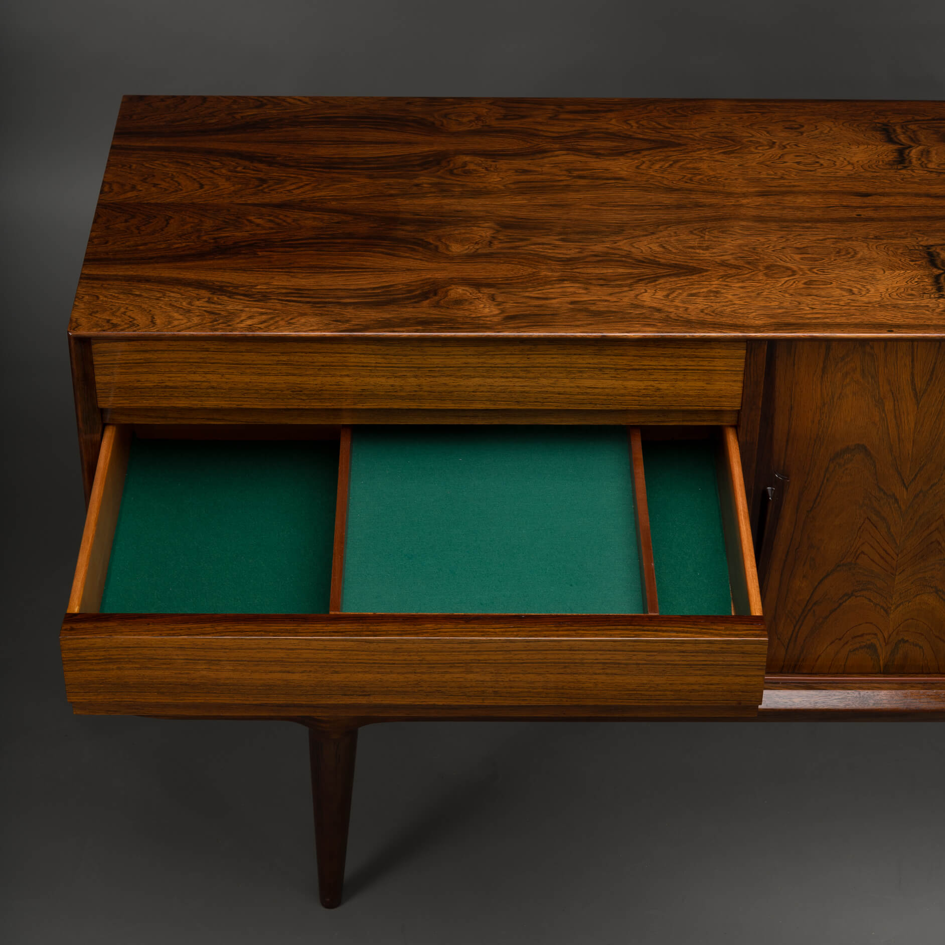 Classic! is dit Model 18 dressoir gedesigned door Gunni Omann. Met z'n zeer herkenbare stijl is dit vintage design masterpiece bepalend voor de vibe van je interieur. Zeer hoog kwalitatief in afwerkingsgraad. Door het gebruik van hoogwaardige materialen brengt deze kast een compromisloos Deens design signatuur in je woning. Het dressoir is uitgevoerd in een subtiel getint palissander met een symmetrische tekening. Verder heeft dit credenza een ladeblok en schuifdeur gedeelte. De vier robuust uitgevoerde lades zijn voorzien van een massief beuken binnenwerk.