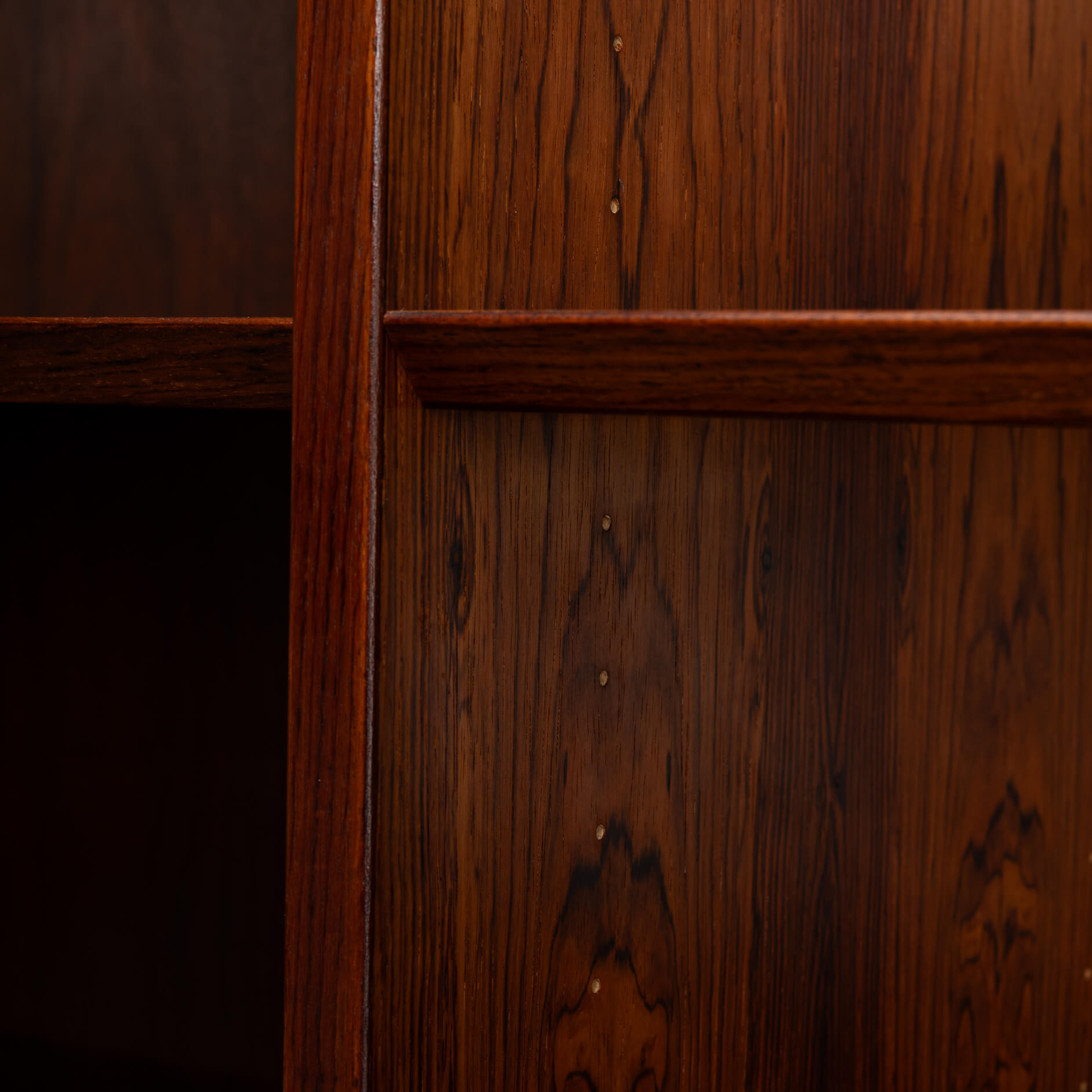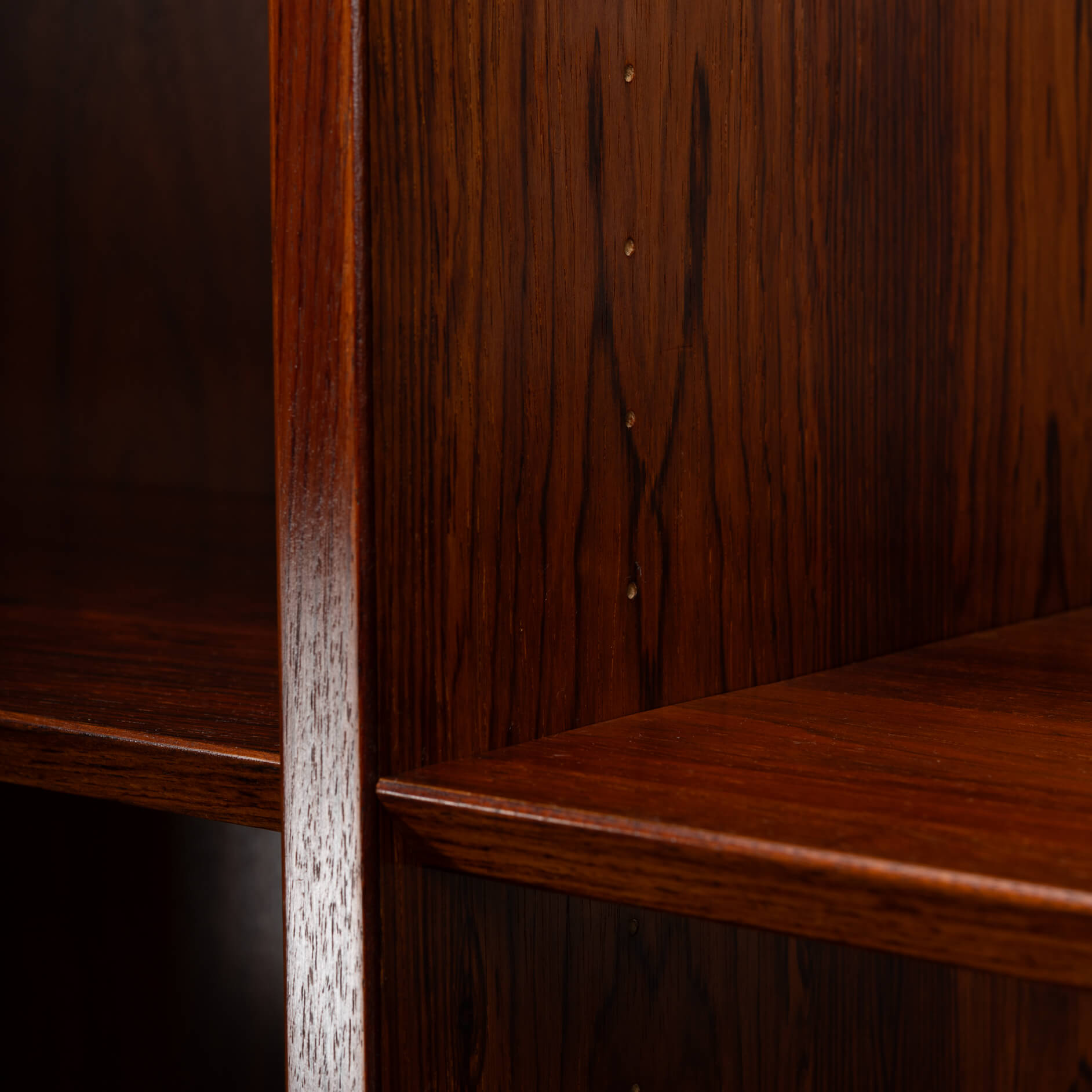 Deense hoge boekenkast in prachtig palissander fineer. De kast is ontworpen door Carlo Jensen en gemaakt door Hundevad & Co. De fabriekssticker op de achterkant is er helaas in de loop der jaren af gevallen. Maar een Hundevad boekenkast is altijd te herkennen aan de planken die afgeschuind zijn.