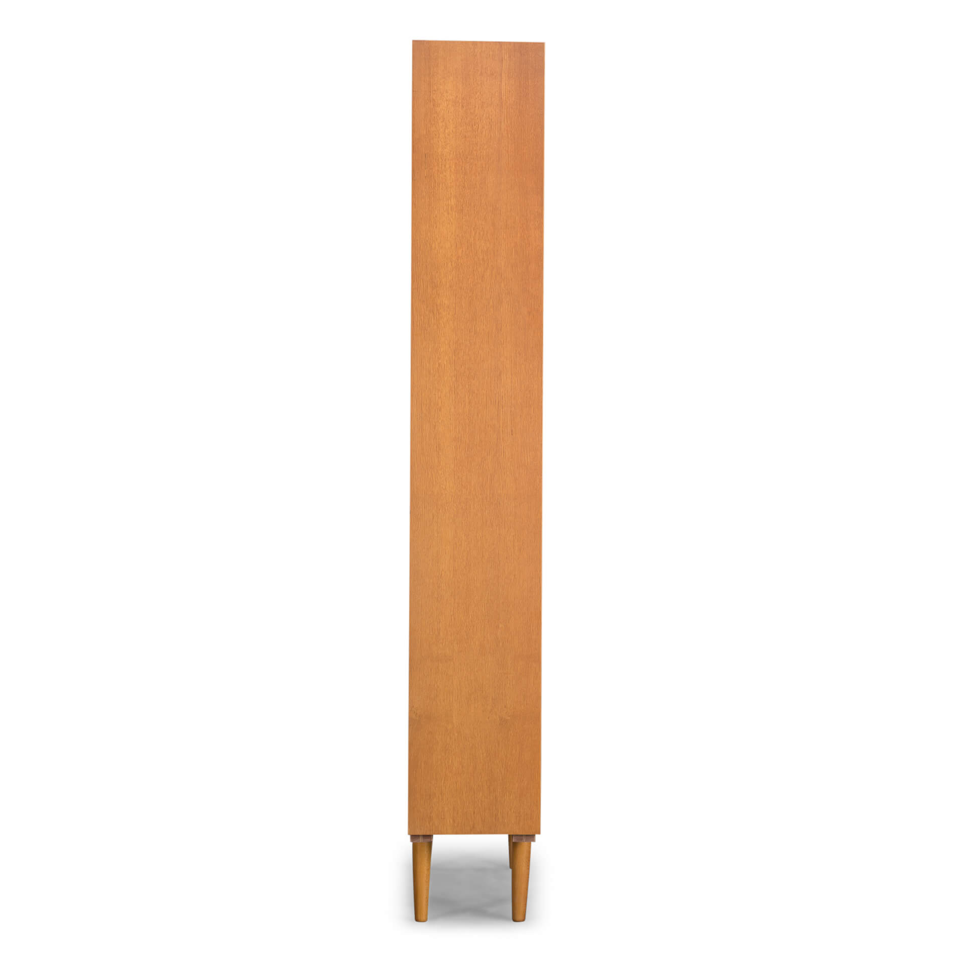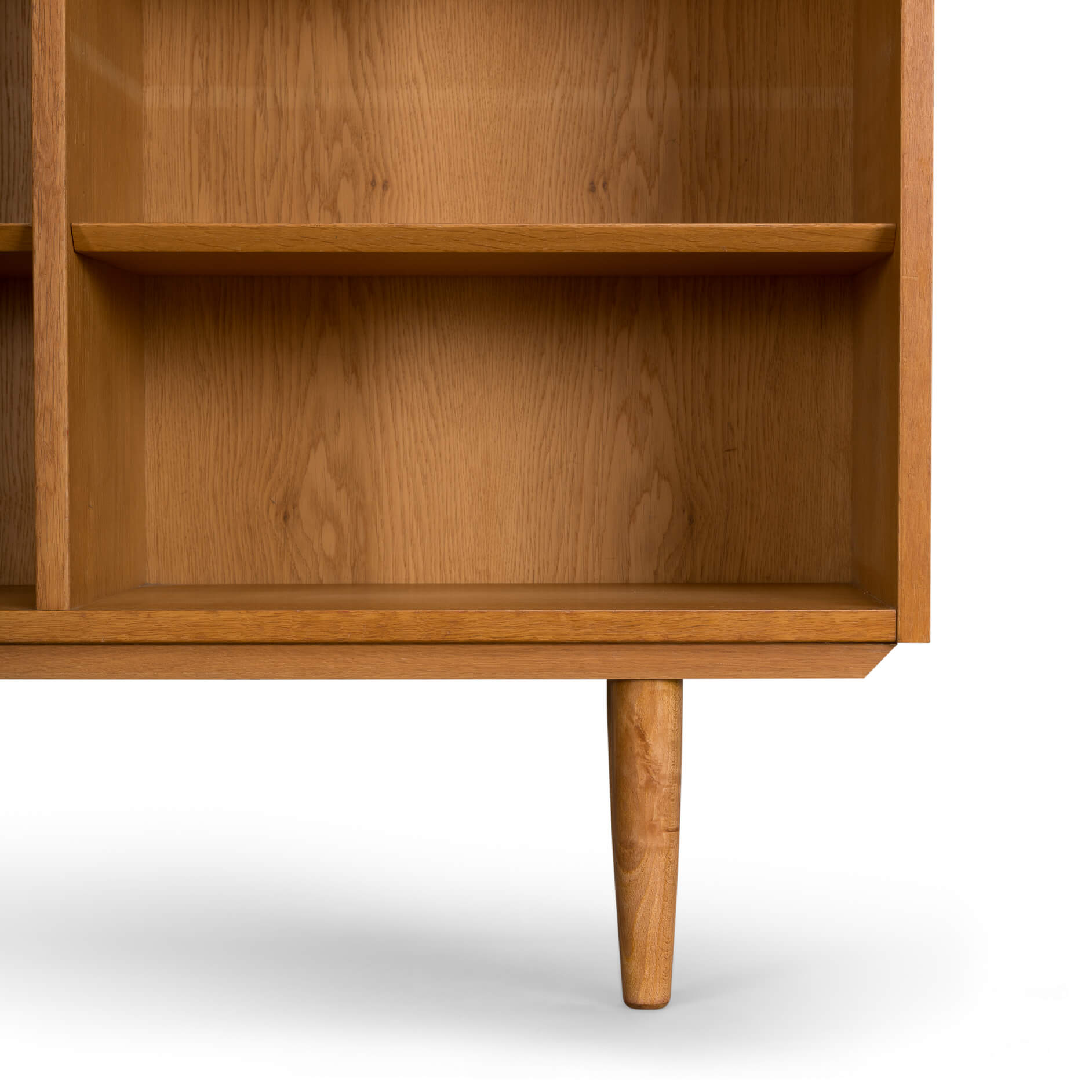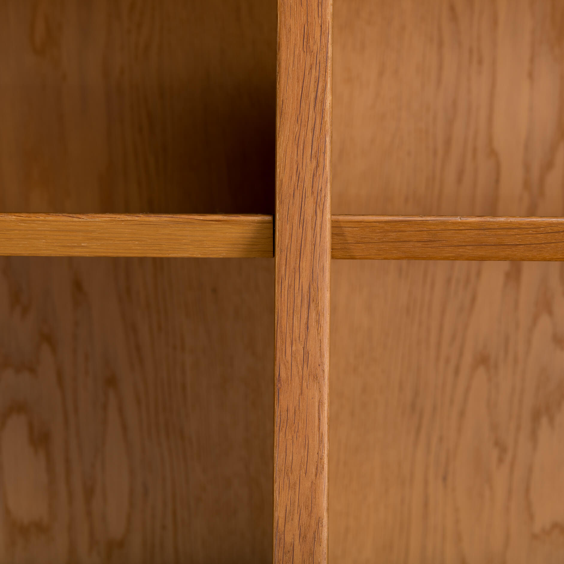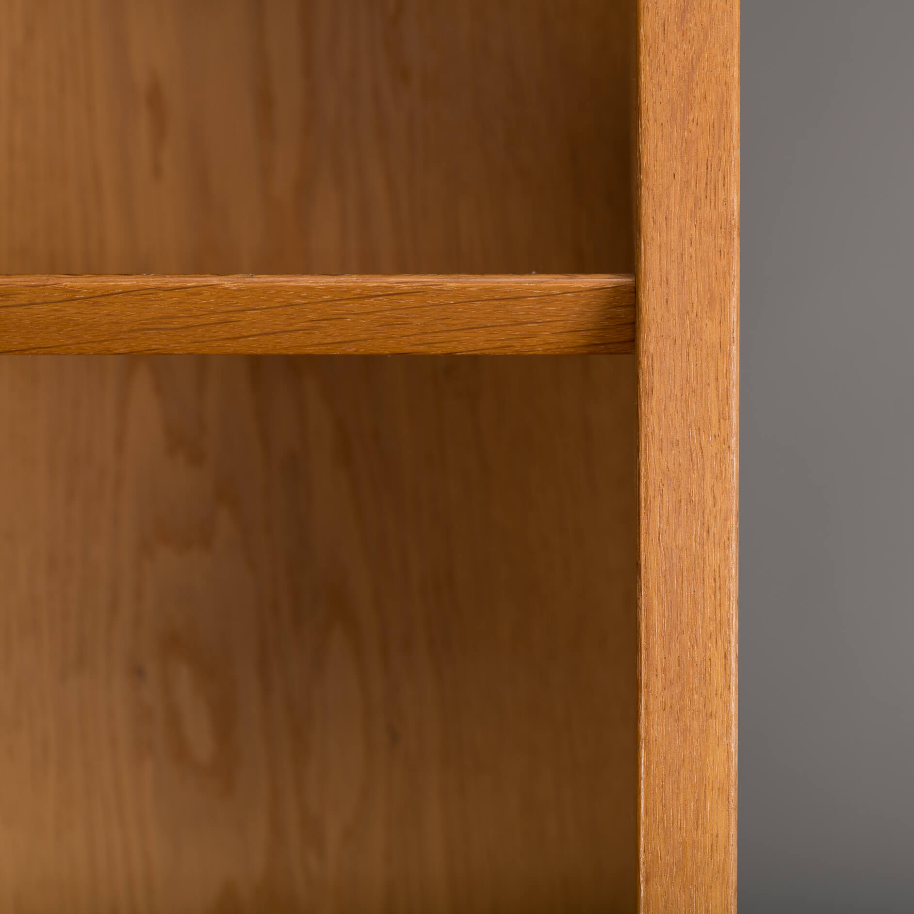 Deense hoge boekenkast in mooi eiken fineer. Vooral deze hoge variant is zeldzaam. Design by Hundevad & Co, altijd te herkennen aan de afgeschuinde planken. De fabriekssticker is er helaas in de loop van de jaren af gevallen. Deze boekenkast verkeert in een zeer goede vintage staat.