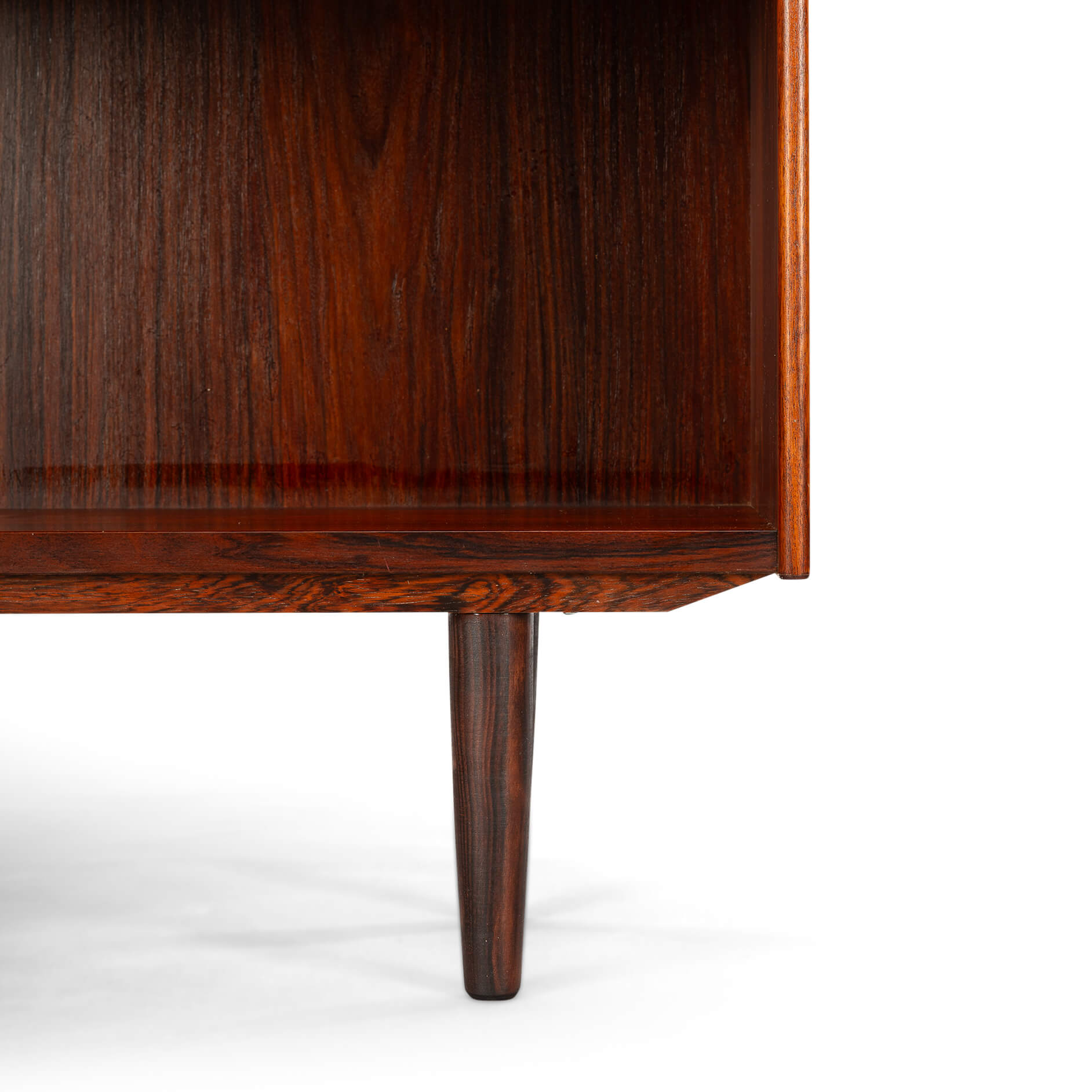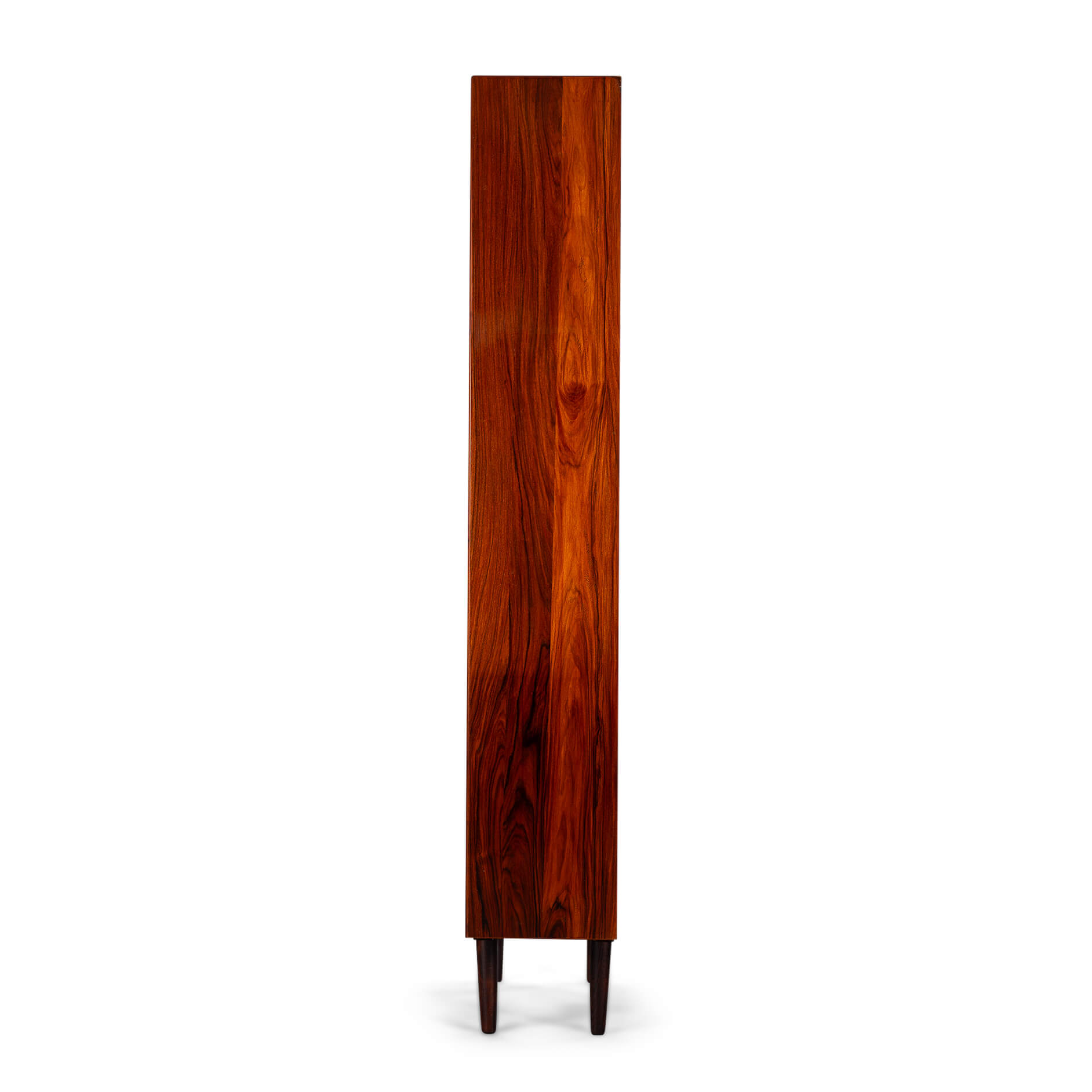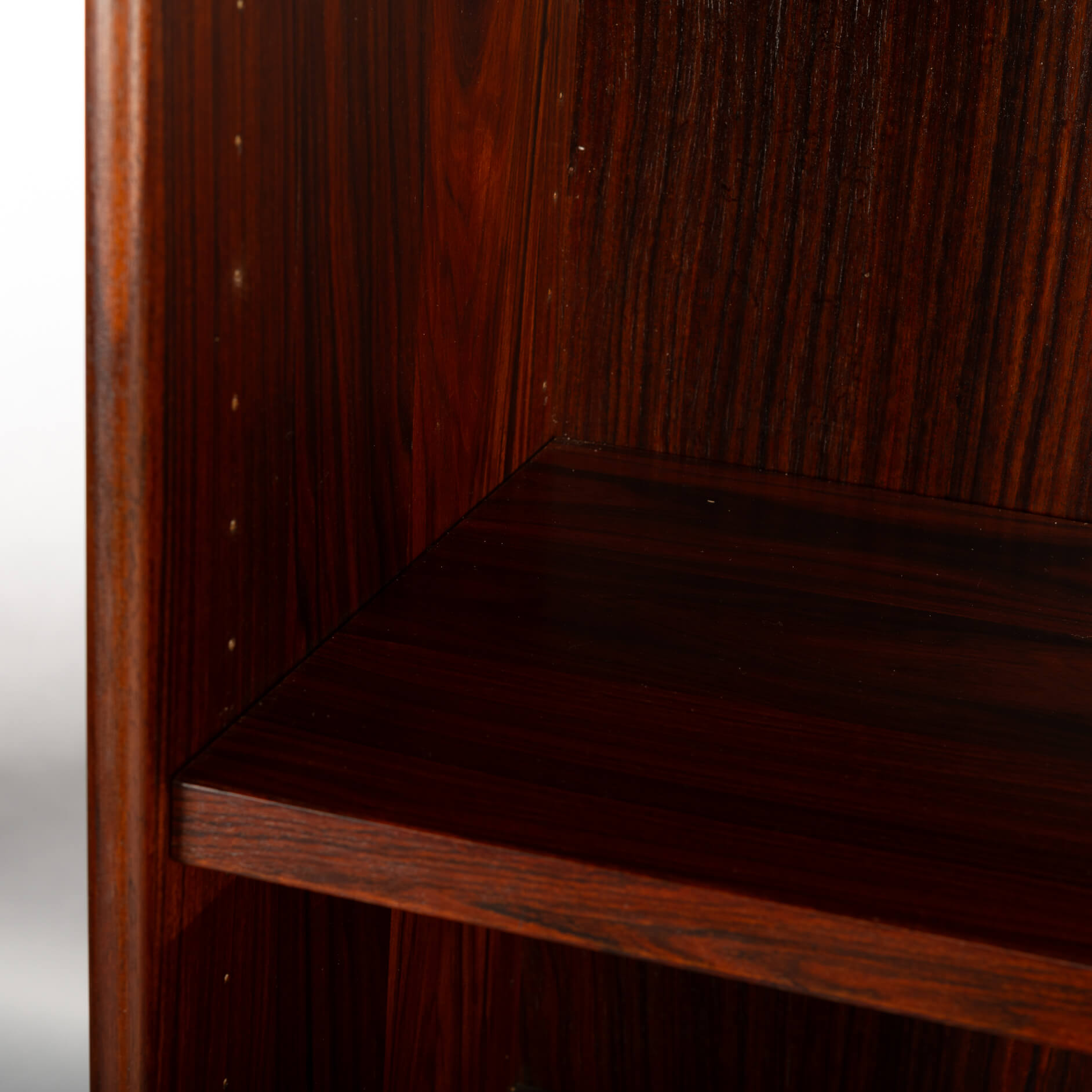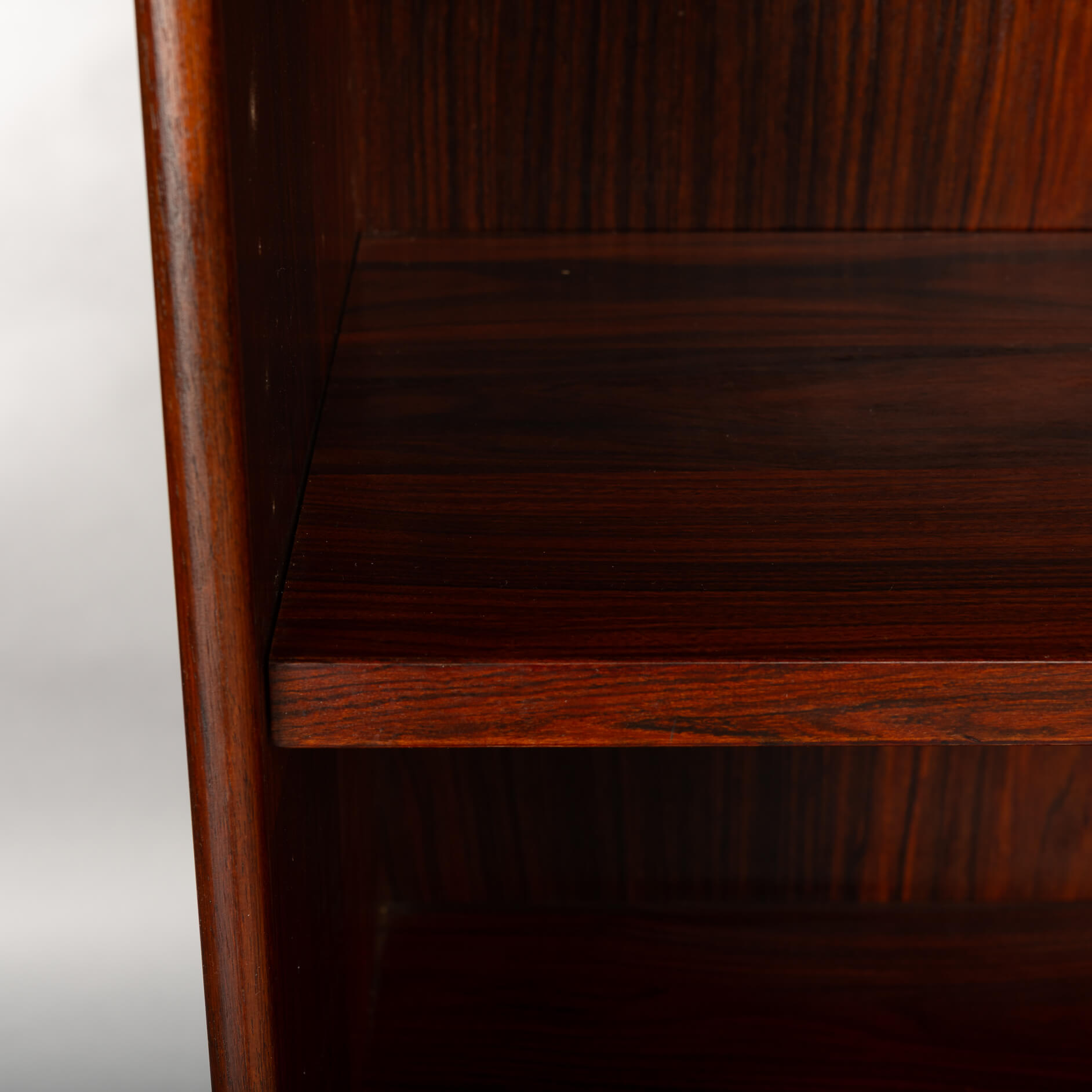 Deense hoge boekenkast in prachtig palissander fineer. Vooral deze hoge variant is zeldzaam. Design by E. Brouer en gemaakt in zijn eigen Brouer Mobefabrik. Deze boekenkast verkeert in een zeer goede vintage staat met enkel een beschadiging aan de rechterzijkant tegen de muur. Zie foto.